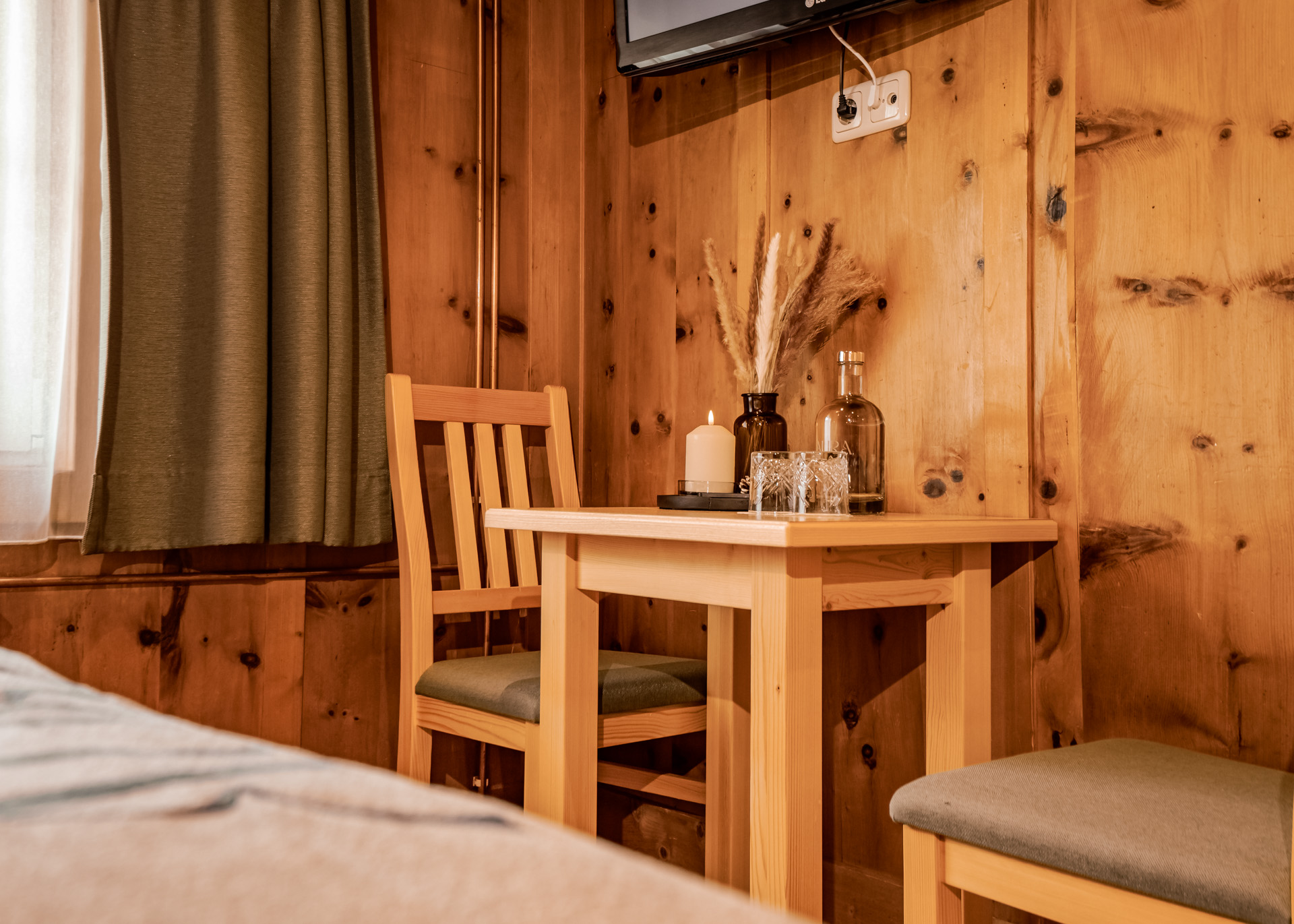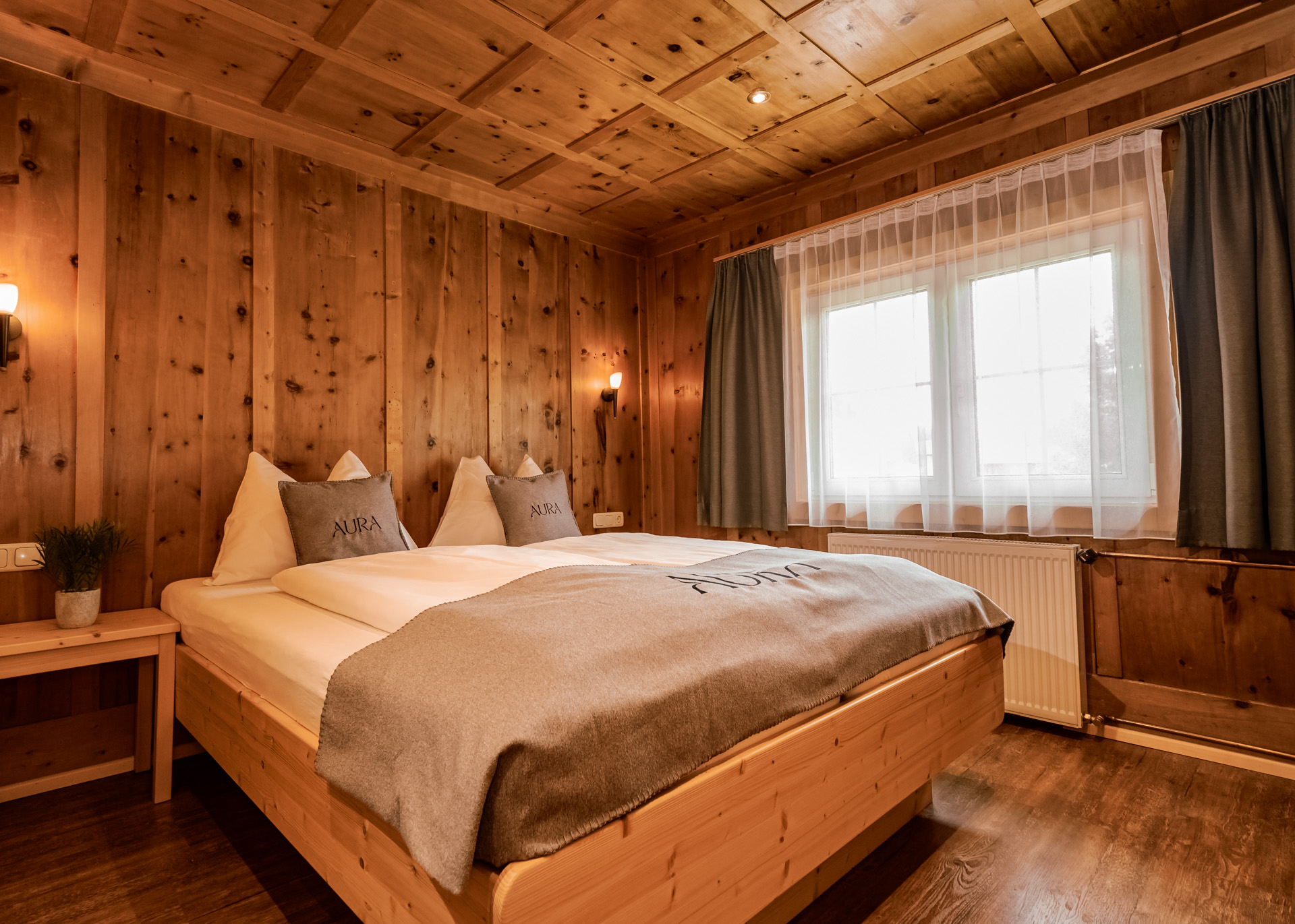 Inmitten von altem handgefertigtem Zirbenholz eröffnet das Florae Doppelzimmer einen traumhaften Blick ins Tal. Die Verbindung von traditionellem Handwerk und modernem Komfort schafft einen Ort der Entspannung und Wohlbefindens.