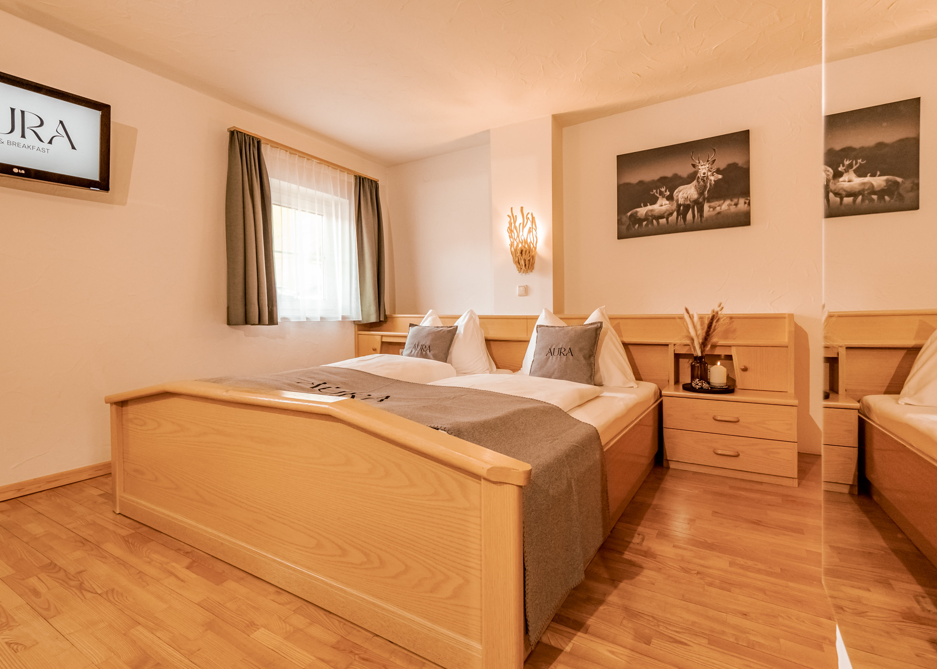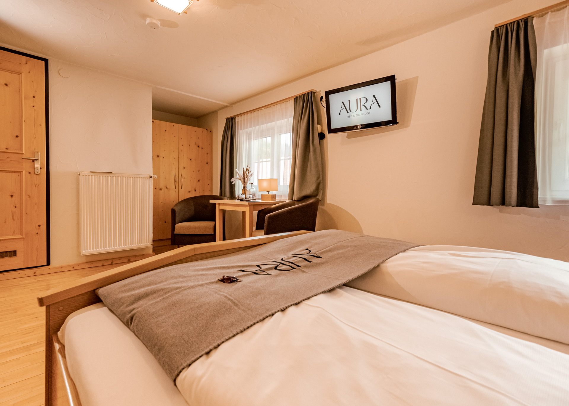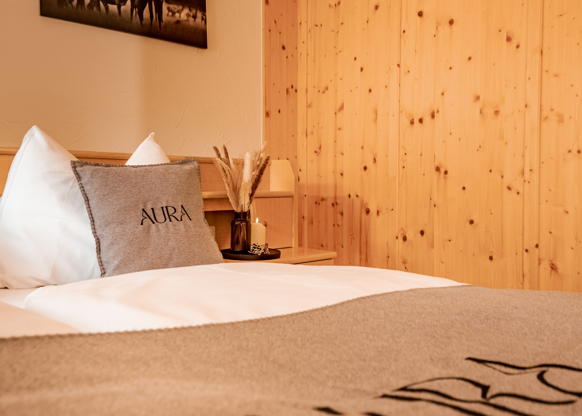 Das Ligna Doppelzimmer besticht durch geräumiges Ambiente und den Ausblick auf die imposanten Berge. Die Verwendung von neuem Zirbenholz schafft eine harmonische Atmosphäre, ideal für entspannte Stunden.